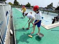 2024年5月31日 08時15分30日(木)、前日の作業に続くこの日は5・6年生がプールサイドの汚れ落としとプール本体の最終仕上げを行いました。
