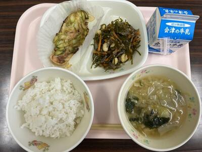 ツナとコーンがたっぷりとのった、おいしいピザをいただきました。ココア豆は、給食センターの皆さんの手作りによる、いり大豆にココアをまぶした甘くておいしいおやつ感覚の大豆です。