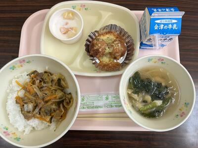 2024年6月4日 09時20分3日(月)の献立は、ごはん、チーズがんも、豚キムチ丼、玉ねぎの味噌汁、フルーツヨーグルト、牛乳です(646kcal)。