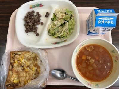2024年6月4日 13時40分今日の献立は、ツナコーンピザ、ミネストローネ、かにかまサラダ、ココア豆、牛乳です(656kcal)。