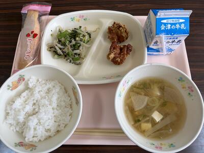 2024年5月27日 17時40分今日は5月生まれのお祝いこんだてです。メニューは、ごはん、鶏のから揚げ、いそあえ、葉玉ねぎのみそ汁、いちごクレープです(705kcal)。