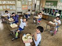 なが~いウインナーをはさんだホットドックに、ほおばる子どもたちも自然と笑顔があふれます。コーンとごぼうのポタージュは、こくがありおいしいひと品でした。サラダのアスパラは、もちろん山都町産です。
