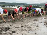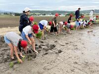 コロナ禍などの影響から、高校生にサポートしてもらいながらの田植えは、実に5年ぶりとなりました。子どもたちは、泥の感触を味わいながら、丁寧に苗を植えていきました。