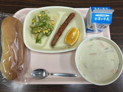 2024年5月28日 16時45分今日のメニューは、ホットドック(切り目入りコッペパン、ロングウインナー)、アスパラのサラダ、コーンとごぼうのポタージュ、きよみオレンジ、牛乳です(710kcal)。