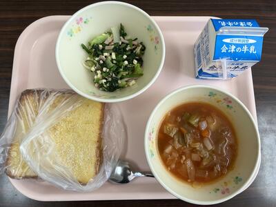 2024年5月14日 17時45分今日のメニューは、四角い?パン、ほうれん草のチーズサラダ、健康応援ミネストローネ、牛乳です(662kcal)。