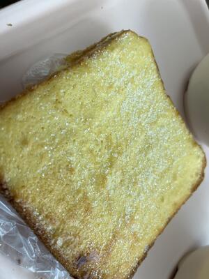 正解は「メロンパン」でした。調理場で調理するには食パンしか使うことができず四角の形ですが、確かに表面がメロンパン状態のとてもおいしいパンでした。みんなの新たな人気メニューとなりそうなひと品です。