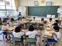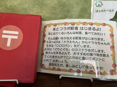 今日のメニューは「本とコラボメニュー」で、メロンパンはドラミちゃんの好きな食べ物、とのこと。山都小学校のみんなに、これからもいろいろな本に親しんでほしいという願いから、今年も「本とコラボメニュー」を計画的に行っていきます。