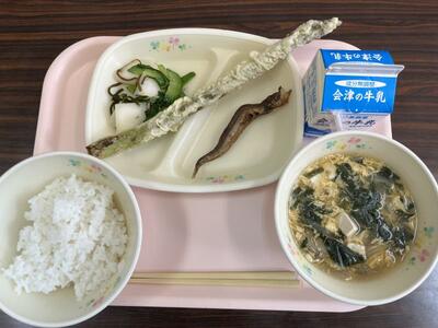 今日は、サンマルちゃんこんだて! 「一口30回よくかみながら、ししゃもとアスパラをおいしくいただきましょう」と栄養教諭からも教室訪問でお話がありました。また、一本まるごと揚げたアスパラの天ぷらは、山都のアスパラのおいしさをまるごといただきました。