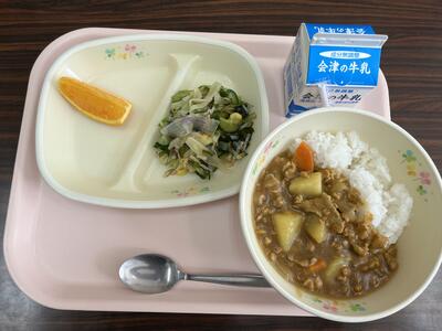 2024年5月17日 16時52分今日のメニューは、ご飯、ポークカレー、こんにゃくサラダ、きよみオレンジ、牛乳です(628kcal)。