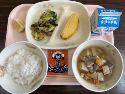 2024年4月26日 18時25分今日は熊本県の郷土料理をいただきました。メニューは、ごはん、牛乳、くまモンふりかけ、つぼんじる(熊本の郷土料理)、厚焼き玉子、野菜炒め、ニューサマーオレンジです(623kcal)。
