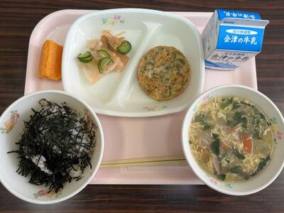 チュモッパは韓国風のおにぎりなのですが、今日は、にぎらずにお茶碗で食べるバージョンです。ごはんにたくあん、ツナ、小ネギ、ごま油、マヨネーズ、きざみのりなどが入ったチュモッパは、配膳室に来た子どもたちが「あ! なんかいいにおいがする!!」と思わず声が出るほど、香り豊かなおいしいメニューでした。今週もおいしくいただきました。