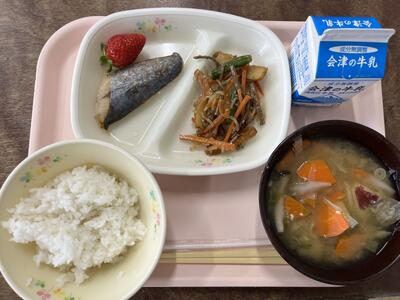 2024年3月18日 17時30分今日は、【ビタミンACEたっぷり免疫力アップこんだて】で、ごはん、牛乳、さつま汁、さわらの梅しおこうじ焼き、ぜんまいの炒め煮、いちごです(665kcal)。