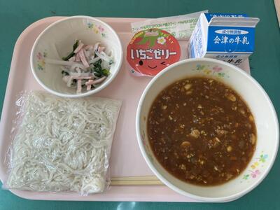 2024年2月29日 15時35分今日のメニューは、大豆入りカレーミートソースパスタ、牛乳、だいこんサラダ、いちごゼリーです(697kcal)。4年生が収穫した大豆を使ったメニューの第2回目です。