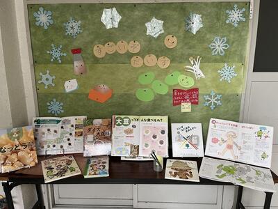 配膳室前の掲示コーナーは、大豆にかんする本や掲示がたくさん飾られています。大豆のよさや素晴らしさがたくさん紹介されているコーナーです。