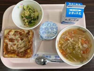 調理員さんが一枚一枚のトーストに具材をのせておいしく焼いてくれたピザト-ストです。どの教室にも、美味しそうに食べる子どもたちの笑顔がいっぱいでした。今日もごちそうさまでした。