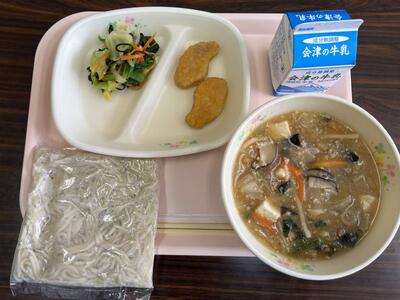 2024年2月22日 15時40分今日のメニューは、マーボー麺、牛乳、チキンナゲット、キャベツの塩昆布漬けです(683kcal)。