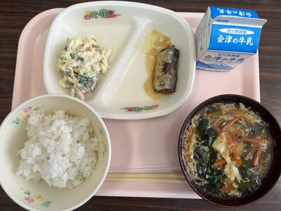 2024年2月28日 14時30分今日のメニューは、ごはん、牛乳、たまごとじスープ、いわしの味噌煮、マカロニサラダです(685kcal)。