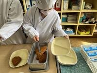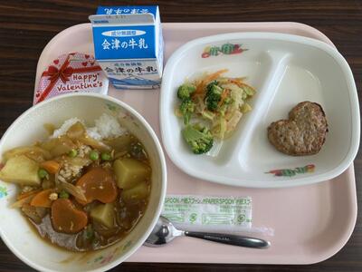 今日のバレンタインデーにちなんで、ハンバーグも、カレーの中のにんじんの形も、チョコレートプリンのデザインもバレンタイン一色にそまって、心もウキウキしてくるようなこんだてでした。