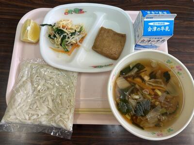 2024年2月15日 14時50分今日のこんだては、きつねもちうどん、牛乳、大根の五色あえ、愛媛産はるかです(623kcal)。