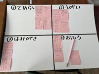 子どもたちは、「手洗い」「うがい」「歯みがき」「おふろ」について、どんなことに気を付けるかグループごとに話し合って考えを出し合いながら、体を清潔に保つためにできることを確かめました。