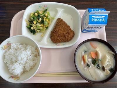2024年2月19日 14時30分今日の味めぐりこんだては、奈良県です。ごはん、牛乳、あすか汁、西京味噌ブリフライ、コーンと小松菜のおひたしです(659kcal)。