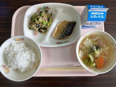 今日も、山都小学校の6年生が家庭科の学習で作成した「一食分のこんだて」からのメニューで、その第7回目です。6年生のKさんが考えてくれたメニューです。さばの味噌煮は、身体にも頭にもたいへんよい青魚をおいしい甘味噌でいただきました。スープは、たっぷりの野菜のうま味がコンソメ味に溶け込んでいて、こちらもおいしくいただくことができました。