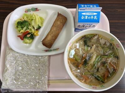 2024年2月8日 15時30分今日のメニューは、味噌ラーメン、牛乳、七種の具材野菜春巻き、野菜サラダです(694kcal)。