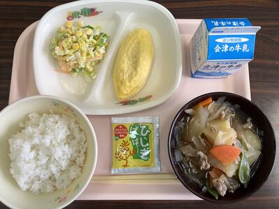 2024年2月9日 13時00分今日の給食は、ごはん、ひじきぱっぱふりかけ、牛乳、肉じゃが、トマトオムレツ、せんキャベツです(704kcal)。
