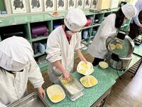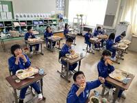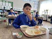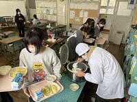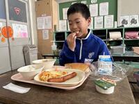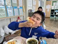 子どもたちは、栄養教諭からのすすめで、コッペパンにフルーツホイップクリームをはさむ人、ポークウインナーをはさむ人、一方にホイップクリームもうもう一方にウインナーをはさむ人、それぞれ好みに合わせ、おいしそうにほおばっていました。