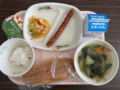 2024年2月13日 16時45分今日は2月生まれのお祝いこんだてです。メニューは、ホイップフルーツサンドパン、牛乳、野菜スープ、ポークウインナー、コールスローサラダ、抹茶ゼリーです(686kcal)。山都小学校の2月生まれのお友達は、みんなで5名です。お誕生日おめでとうございます。