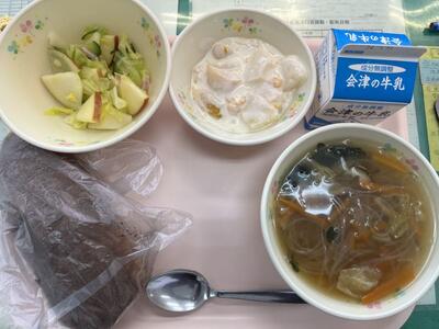 今日のメニューは、山都小学校の6年生が家庭科の学習で作成した「一食分のこんだて」からのメニューで、その第2回目です。6年生のIさんが考えてくれました。給食の時間には、放送委員会からお昼の放送を通じて紹介がありました。