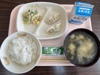 2024年1月17日 12時50分今日のメニューは、ごはん、野菜ふりかけ、牛乳、大根のみそ汁、餃子、ツナサラダです(634kcal)。