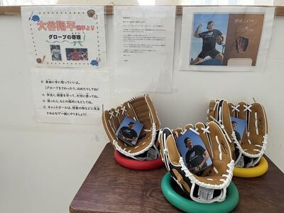 2024年1月19日 13時30分山都小学校にもついに届きました。大谷選手からのグローブです。さっそく、職員室前に展示コーナーに、大谷選手からのメッセージとともに、お披露目しました。大谷選手、ありがとうございます。