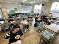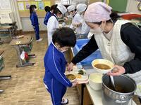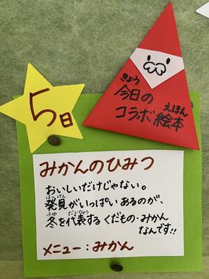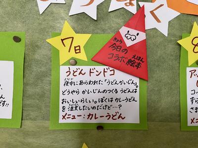 2023年12月7日 14時50分今日の絵本とのコラボメニューは、カレーうどんです。お昼の放送では、栄養教諭が絵本『うどんドンドコ』のお話の前半部分を読み聞かせしてくれました。「夜中に現れる”うどん怪人”のうどんがとてもおいしいらしく、主人公のぼくは、うどんを注文したいんだけれど・・・・」というお話です。この絵本の中にも、カレーうどんが出てきます。