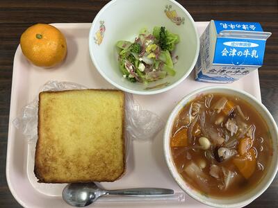 2023年12月5日 14時10分今日は、フレンチトースト、牛乳、ポークビーンズ、ブロッコリーのイタリアンサラダ、みかんです(597kcal)。