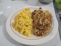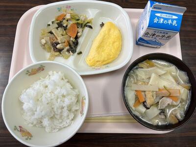 2023年12月8日 14時50分今日のこんだては、ごはん、牛乳、みそ豆乳ほうとう汁、チーズオムレツ、八宝菜です(668kcal)。