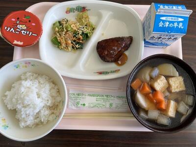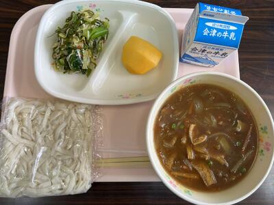 今日のメニューは、カレーうどん、牛乳、すき昆布のサラダ、会津みしらず柿です(705kcal)。磯の香りと歯ごたえのよい昆布のサラダも、甘みが柔らかく口いっぱいに広がるみしらず柿もとてもおいしくいただきました。