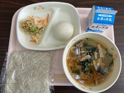 今日のメニューは、みそラーメン、牛乳、ミニ肉まん、だいこんとたまごの五色あえです(668kcal)。