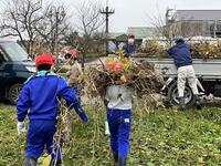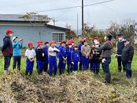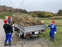 農業支援員の方々にご指導いただきながら、刈り取った大豆をトラックに乗せ、学校の体育館脇にしばらく乾燥するために並べました。