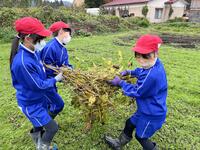 大量の大豆の枝を、4年生のパワーの結集で運び終えた子どもたちには、満足そうな表情が満ちあふれていました。