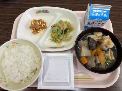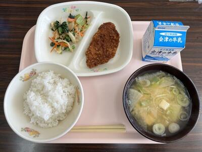 今週の給食メニューは、「地場産物活用」推進週間です。そして今日は、いわき市のかじきカツ、喜多方市のほうれんそうのごまあえ、こはん、牛乳、みそ汁です(651kcal)。