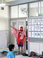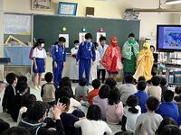 脳にスイッチを入れるんジャー(黄)、おなかにスイッチ入れるんジャー(緑)、体にスイッチを入れるんジャー(赤)などが、朝食の働きを全校生のみんなに分かりやすく解説してくれました。