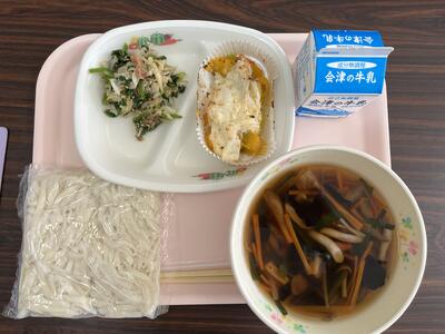今日のメニューは、きのこうどん、牛乳、かぼちゃとチキンのマヨネーズ焼き、チンゲンサイのおひたしです(663kcal)。