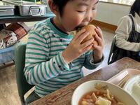 ボリューム感のあるしょうゆ味の和風ハンバーグと、きゅうりと、チーズをはさみ、大きな口でほおばりました!きょうもおいしくいただきました!!