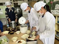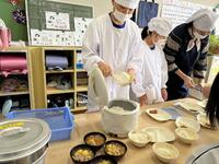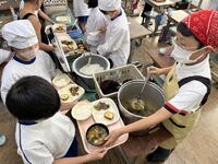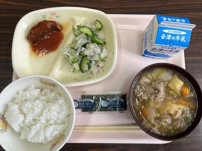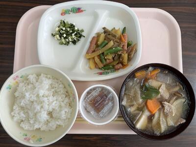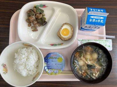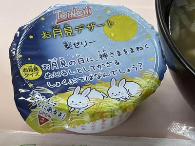 2023年9月29日 13時00分今日は中秋の名月、給食はお月見こんだてです。メニューは、ごはん、牛乳、だんご汁、スコッチエッグ、仙台麩なすみそいため、お月見ゼリーです(685kcal)。
