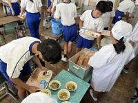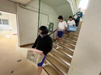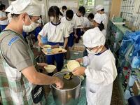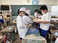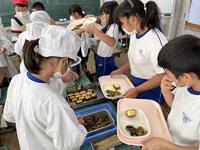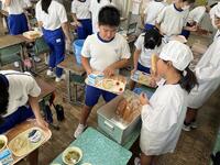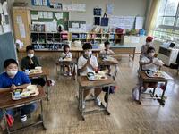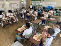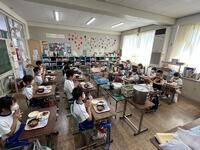 体力テストのあとの6年生。力いっぱい動いた後の給食を、もりもりいただきました。