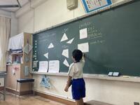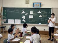 2023年10月2日 16時30分2年生教室で、算数の校内授業研究会を行いました。めあては「どうやったら三角形や四角形を見つけられるかな」。