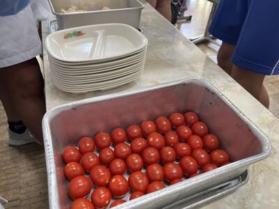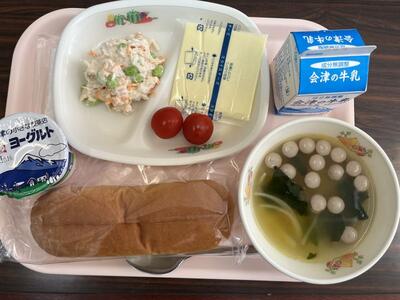 たっぷりのツナと、ミニトマト、チーズなどをはさんだツナサンドとかぼちゃのスープ。今日も喜多方市産の野菜がたっぷりと使用されたおいしい給食でした。