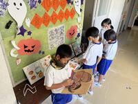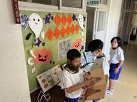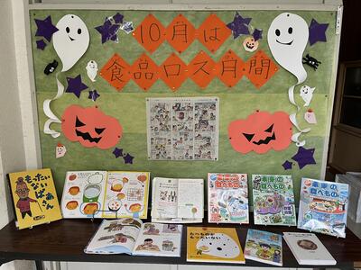 2023年10月6日 14時30分10月は、食品ロス月間! 配膳室前の掲示板には、ハロウィンのお化けたちが、食べ物のもったいなさを紹介しています