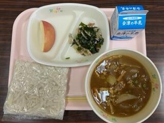 カレーうどんは、シイタケや油揚げも入って、ダシもきいたおいしさでした。喜多方産のリンゴは、新鮮なシャリシャリ感と甘さがいっぱいつまったおいしいリンゴでした。